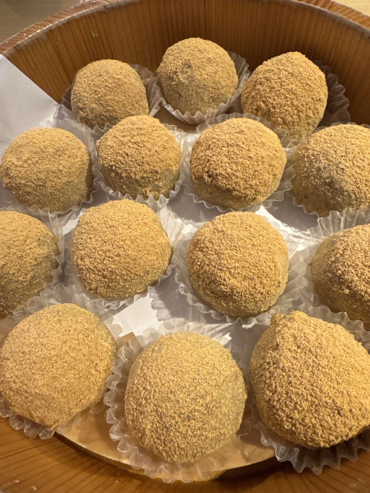 焙煎したくるみ・大麦・玄米・黒豆・ごまを砕いてもち米と搗き、中に粒あんを包みました。きな粉でまぶした秋の味覚たっぷりの餅まんじゅうです。